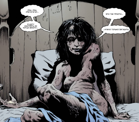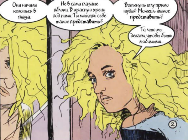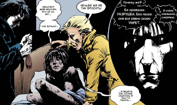 Нил Гейман показывает, насколько её организм разрушен изнутри и прямо говорит нам о том, что смерь девушки наступит достаточно скоро и будет также мучительна, как смерть всех зависимых от наркотиков людей.