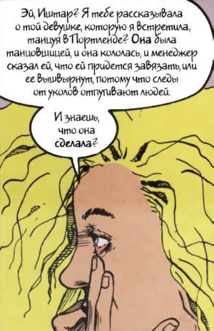 В выпуске № 45 вы видим диалог двух «танцовщиц», Тиффани рассказывает Иштар о своей наркозависимой знакомой. Они совсем не удивляются самому факту употребления наркотиков (которе было абсолютно естественно в те годы в США), бОльший шок у них вызывает место уколов — зона глаз.