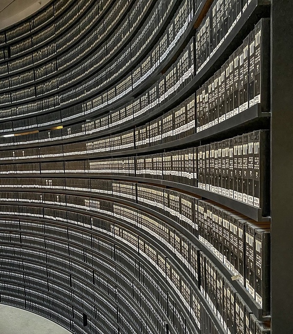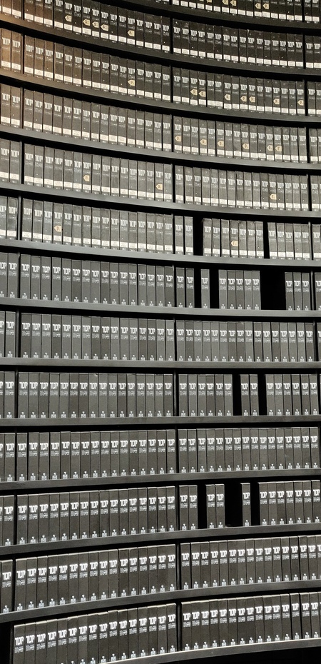 На изображениях представлены стеллажи, заполненные черными папками, каждая из которых содержит листы свидетельских показаний. Эти документы содержат имена и краткие биографии жертв Холокоста, представляя собой важный элемент памяти и увековечения их историй. Каждая папка символизирует отдельную судьбу, напоминая о трагедии, затронувшей миллионы людей.