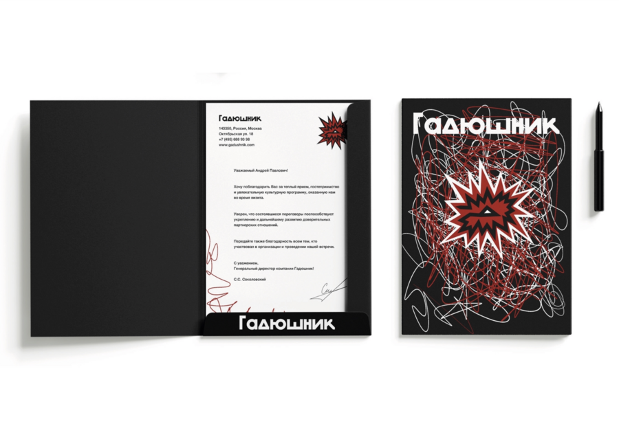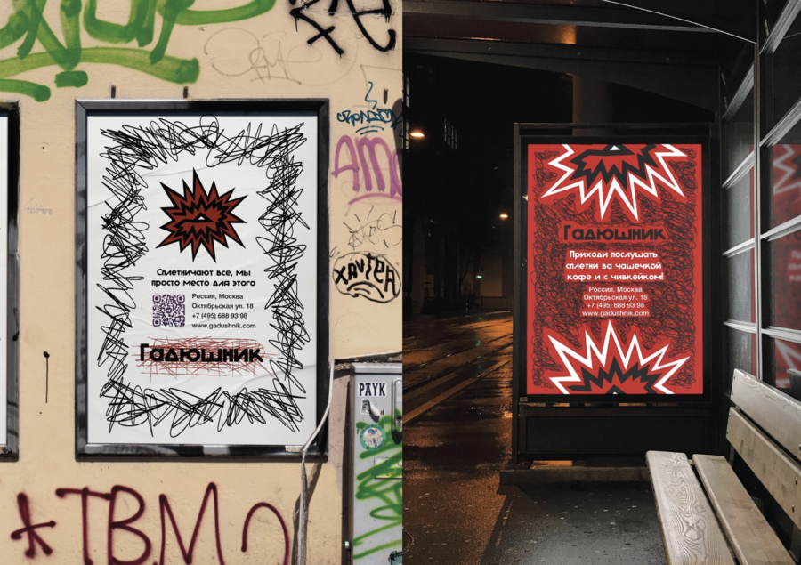 Промт: Фирменный стиль кафе по обсуждению сплетен, называется Гадюшник. Визуальный стиль: яркий, динамичный, дерзкий, угловатый с цветами красный белый черный. Типография: плотная, без засечек, с толстыми прописными гротескными буквами. Логотип и макеты выглядят органично и ориентированы на человека. Яркие элементы сочетаются с композицией. Единый визуальный язык во всех материалах — визитках, буклетах, и мерче. Эмоции: шепот, таинство, диалоги, динамичность, откровенность.