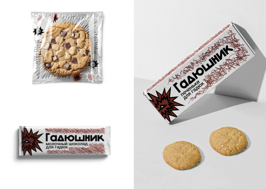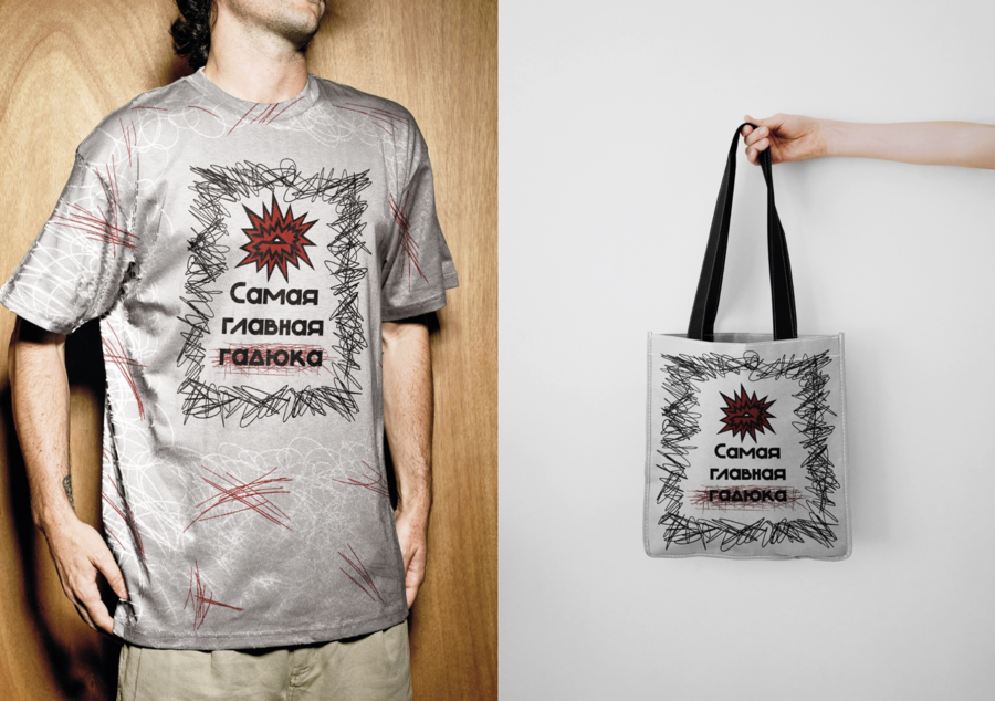 Промт: Визитка, меню, мерч в стилистике Гадюшника (браслет, футболка, кружка, шоппер, пачка печенья, интерьер, вывеска, тарелки, плакаты). Логотип «ГАДЮШНИК» (со змеёй и баблами 💭🗯️) виден в кадре на предметах.