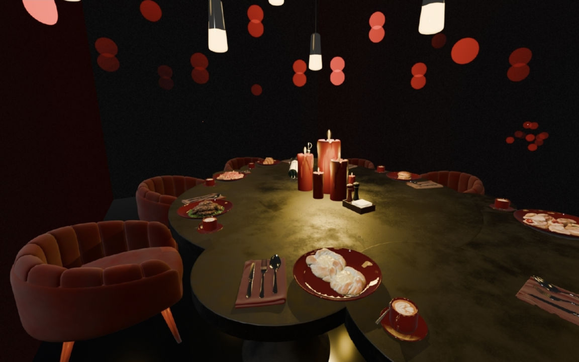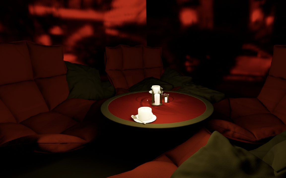 Промт: Атмосфера кафе по обсуждению сплетен Гадюшника: неон, сплетни при свечах, уединение.