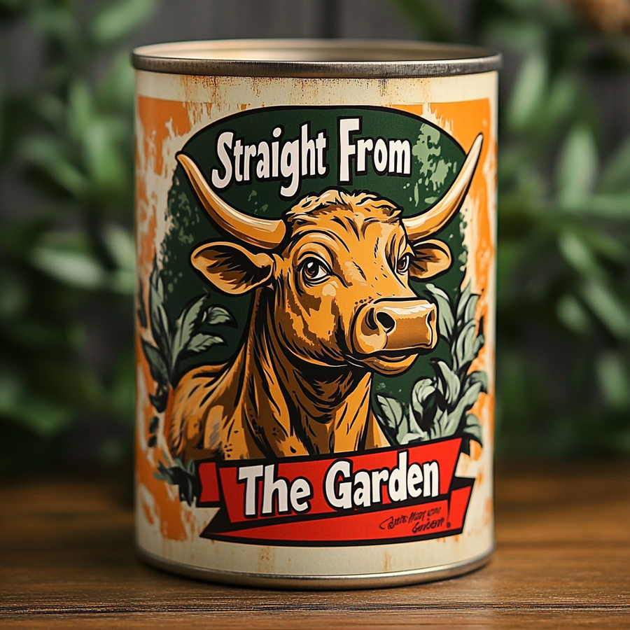 Для создания банки тушенки было использовано готовое фото. Тушенка: https://s.mj.run/4pAdUJ80NF0 a new photorealistic can with minimalistic naming «Straight From The Garden» with a simple brown happy cow drawing on it, green, orange and white, Hay Day game style