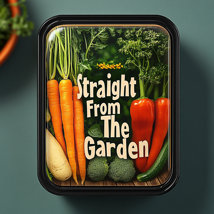 Овощи: https://s.mj.run/AblPxpBdXPg a photorealistic package of vegetables with minimalistic naming «Straight From The Garden» with green, orange and white, Hay Day game style