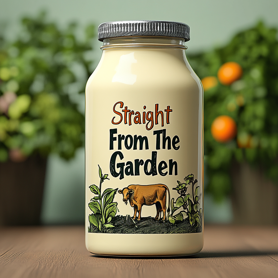Молоко: https://s.mj.run/AblPxpBdXPg a photorealistic bottle of milk from glass with minimalistic naming «Straight From The Garden» with green, orange and white, with a brown cow, Hay Day game style