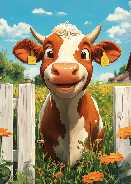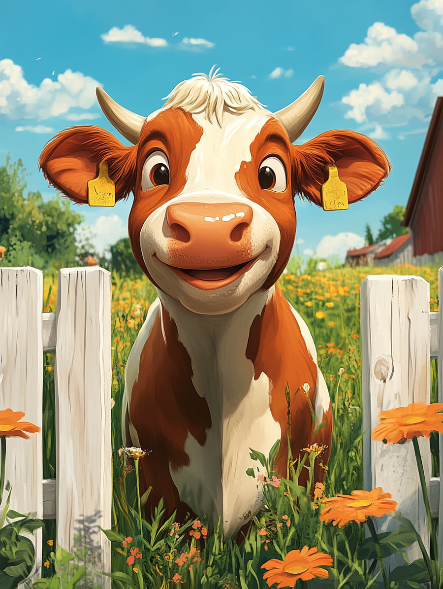 1. https://s.mj.run/AblPxpBdXPg bottom view, poster of a happy smiling cow on a farm behind white fence with green, orange and white, Hay Day game style, --ar 3:4 --iw 0.5