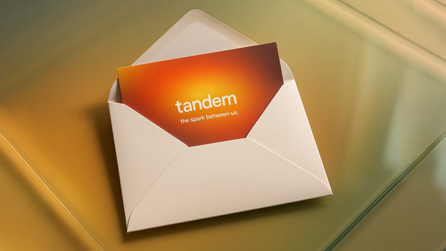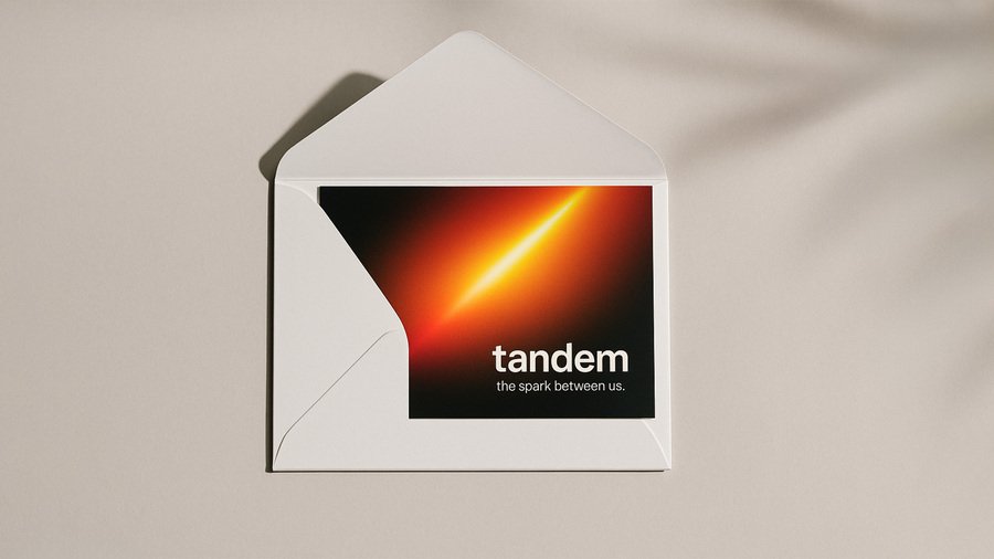 image 1 prompt: realistic product photo of an open premium envelope with a visible card inside. the envelope is matte white with clean minimalist lines, lying on a soft neutral background with natural lighting and gentle shadows. inside the envelope, a card features a vivid glowing gradient design in warm red, orange, and yellow hues, softly diffused across the surface. the «tandem» logo is printed on the card, with a tagline below reading «the spark between us.» high-quality realistic render, modern stationery design, aspect ratio 16:9