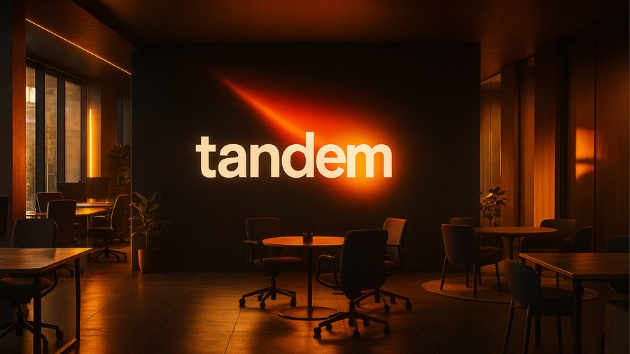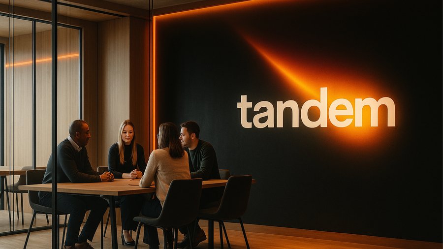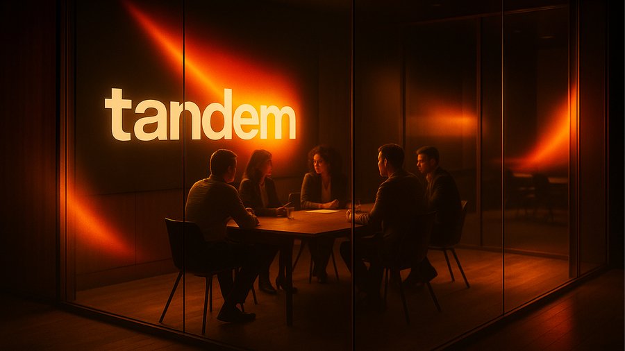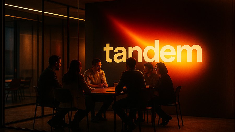 2-3 image prompt: realistic cinematic visualization of a modern meeting room. the space features glass walls and partitions, clean minimalist furniture, and natural materials such as wood and matte metal. warm cinematic lighting with soft shadows and glowing gradient accents in vivid red, orange, and yellow tones. several people are seated around a modern table, engaged in discussion or collaboration, illuminated by the warm glow that reflects softly on the glass surfaces and faces. deep black and neutral tones balance the composition, with subtle golden highlights and reflections. incorporate the attached logo image naturally into the scene — as the main Tandem branding element on a wall blending seamlessly with the lighting and environment. the logo should replace any textual «tandem» reference and match the overall gradient glow aesthetic. minimalistic, warm atmosphere, premium realistic office interior render, high-quality professional visualization aspect ratio 16:9
