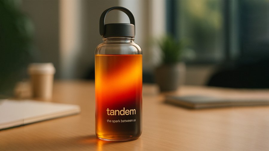 prompt image 2: realistic product photo of a reusable water bottle with a handle, made of transparent glass or high-quality BPA-free material. the bottle features a vivid gradient in warm red, orange, and yellow tones, smoothly diffused across the surface without motion blur. the «tandem» logo is placed clearly in the center, with a tagline below reading «the spark between us.» set on a modern office desk environment — soft natural lighting, warm reflections, blurred background with notebooks, coffee cups, and plants. minimalistic, cinematic. premium realistic render, product photography, high-quality image, aspect ratio 16:9