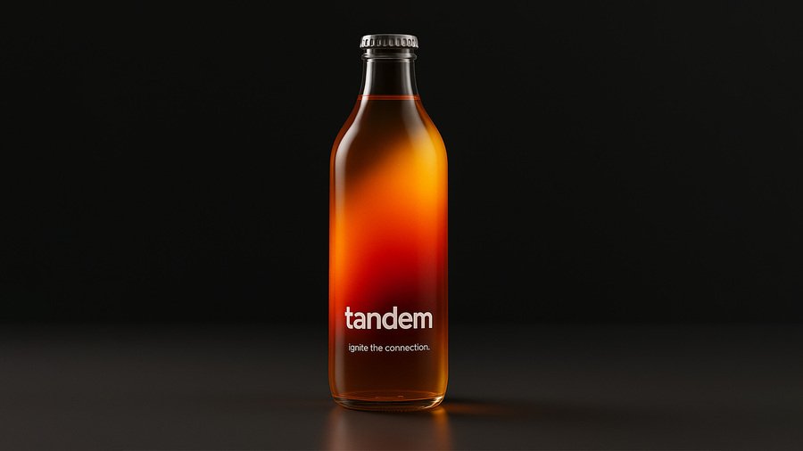 prompt image 1: modern product visualization of a transparent glass bottle standing on a neutral reflective surface. the bottle features a vivid gradient design in warm red, orange, and yellow tones — smoothly diffused across the glass without motion blur. minimalistic composition with a clean dark background, subtle reflections, and cinematic soft lighting highlighting the transparency and color transitions. the «tandem» logo is placed clearly in the center of the bottle, and a small tagline below it reads «ignite the connection.» a balance of warmth and clarity. realistic high-quality render, product photography style, aspect ratio 16:9