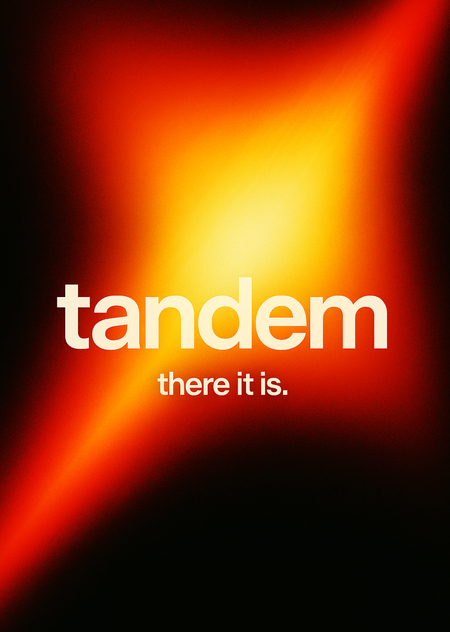poster 2 prompt: a modern poster design where a massive motion-blurred glowing gradient spark stretches from corner to corner, filling nearly the entire composition as if viewed in extreme close-up. the spark should appear large, radiant, and dynamic, creating a soft yet vivid explosion of red, orange, and yellow light that smoothly diffuses across a deep black background. place the «tandem» logo and tagline «there it is.» centered in the middle of the composition, surrounded by the glow, ensuring the typography remains bold, modern, and over the light. high-quality, aspect ratio 210 × 297 mm