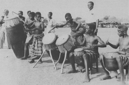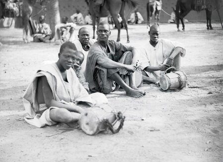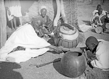 Традиционная барабанная практика в африканском этническом сообществе. Документальное фото, 1935 г.