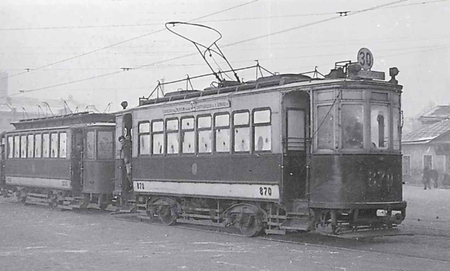 Первый четырехосный вагон КМ № 2001 с пантографом (справа) у Казанского вокзала, 1928 г.