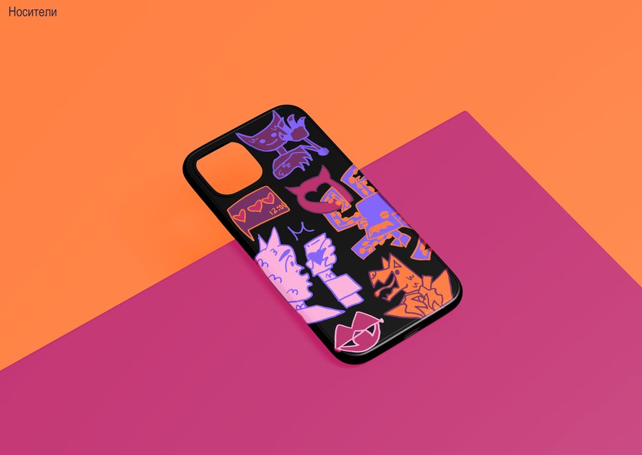 Продукция создана в нейросети Ideogram. Промт также сгенерирован с помощью DeepSeek по запросу: напиши промпт на английском для фотографии чехла на телефон с разноцветными монстрами в розово-фиолетово-оранжевой палитре в дерзком простом стиле.