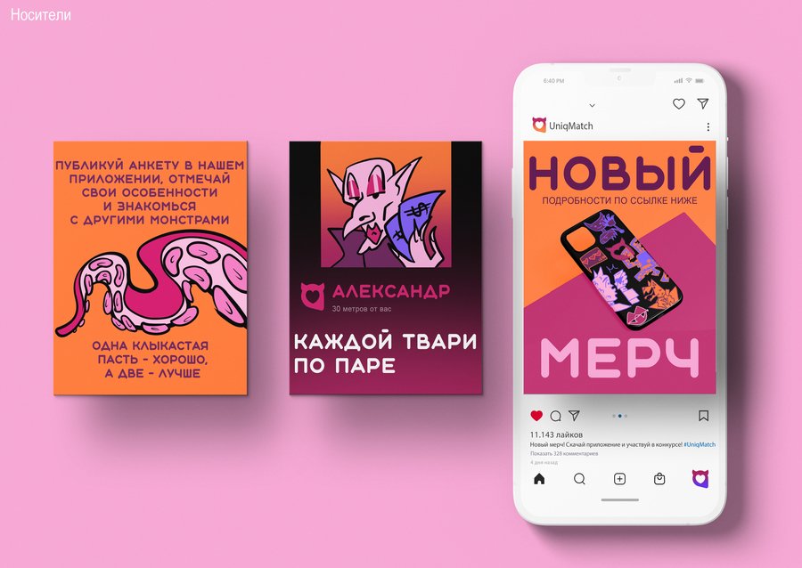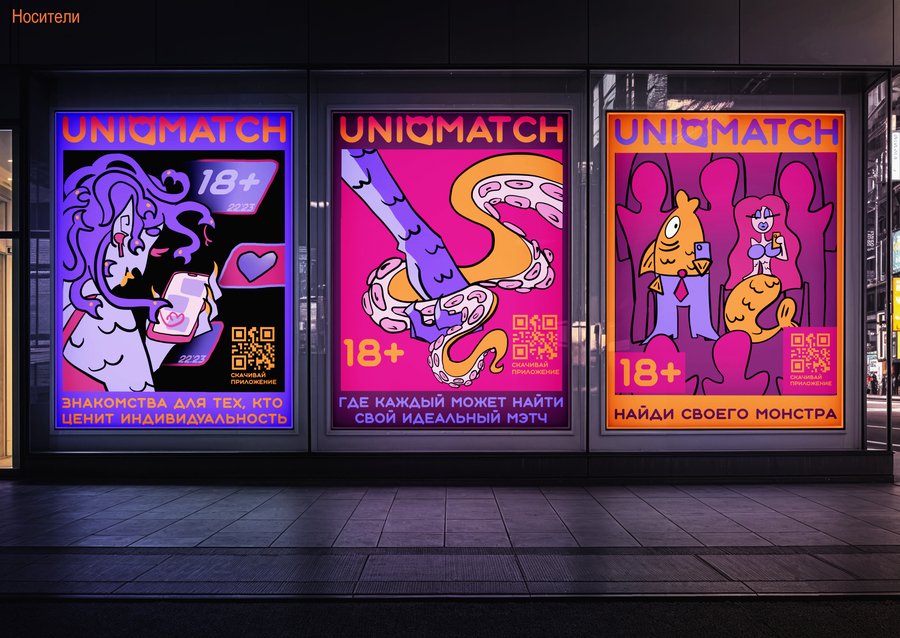 - The second poster (center) features a playful monster looking at its phone with a heart emoji above its head, with the text: «UniqMatch: Find Your Click.»