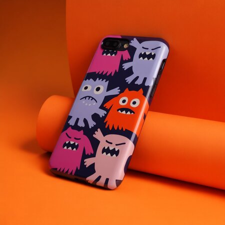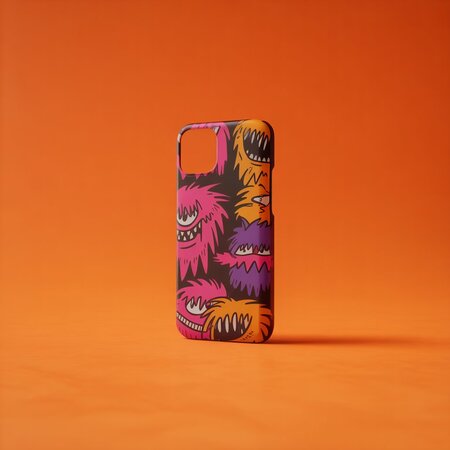 Promt: Product photography of a smartphone case on a orange background. The case features a bold, simple design of colorful, edgy monster characters in a messy vector art style. The monsters are in a vibrant palette of pink, purple, and orange. The style is minimalist, playful, and slightly rebellious. Professional lighting, sharp focus.