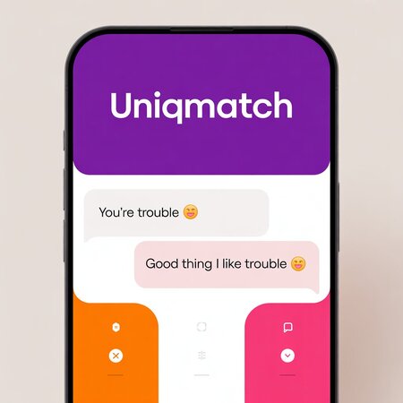 Promt: UI/UX mobile screen, dating app chat interface on a smartphone. The app is called UniqMatch. Show a flirtatious conversation between two users with playful, slightly edgy text messages. Interface has a bold, simple design with a solid purple background for the header and vibrant orange and hot pink buttons and accents. The text bubbles are white and pink. Clean, modern, minimalist