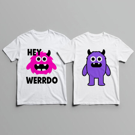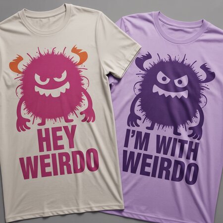 Promt: Flat lay photography of two matching couple t-shirts placed side by side on a light gray background. The t-shirts feature a bold, simple design of edgy, playful monster characters in a messy vector art style. The left shirt has a pink monster with text «Hey Weirdo», and the right shirt has a purple monster with text «I’m With Weirdo». The color palette is vibrant pink, purple, and orange. Minimalist, slightly rebellious style. Professional product.