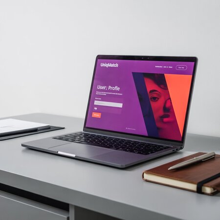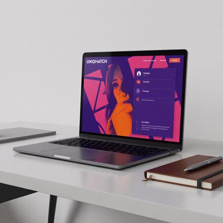 Promt: product shot of a laptop on a desk, screen displaying the UniqMatch website user profile. The website has a bold, edgy design with sharp, minimalist patterns and a clean layout. The UI uses a striking color scheme of purple, pink, and orange. The desk is clean and modern, with a notebook and a pen. Studio lighting, crisp and clear, website UI mockup.