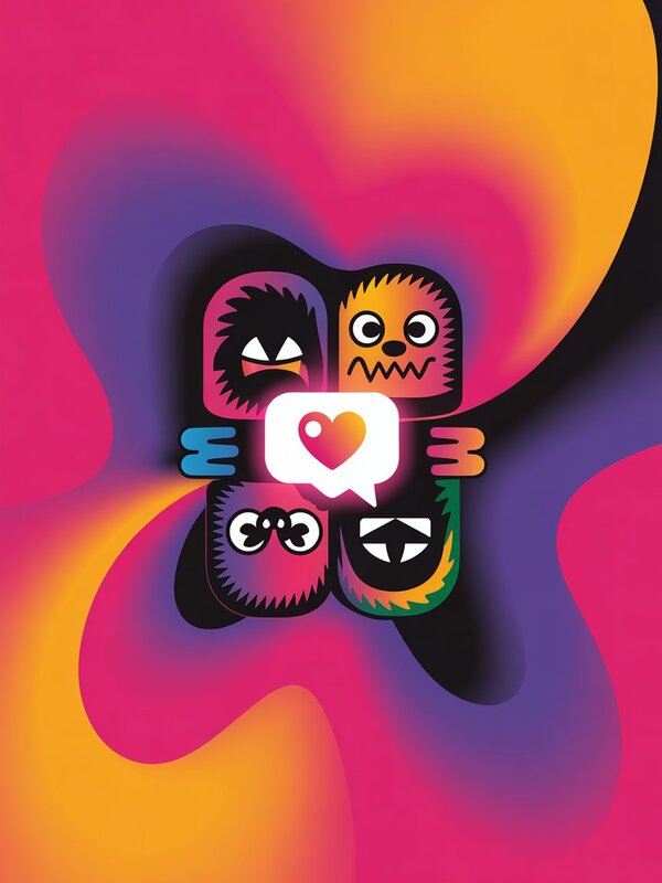 Запрос в DeepSeek: Напиши промт для генерации иллюстрации для бренда UniqMatch. Минималистичные персонажи монстры в неряшливом векторном стиле переписываются друг с другом в чате.