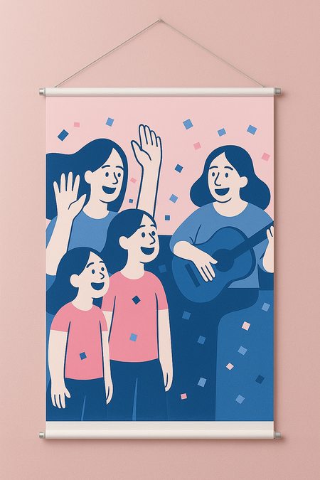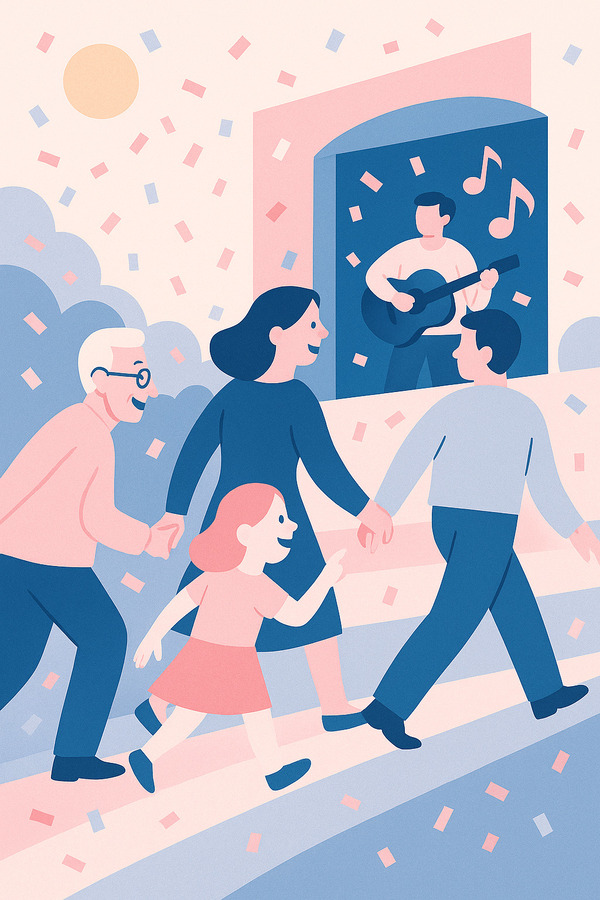 Иллюстрации выполнены в мягкой палитре розовых и синих оттенков, создающих ощущение теплоты, доверия и лёгкого праздника. Фигуры намеренно обобщены и лишены деталей, чтобы внимание сосредоточилось на жестах, движении и взаимодействии между людьми. Конфетти и световые акценты добавляют ощущение события и радости — того самого момента, который хочется разделить с близкими.