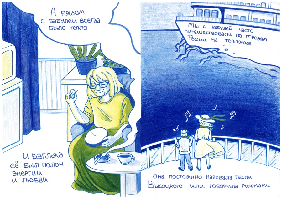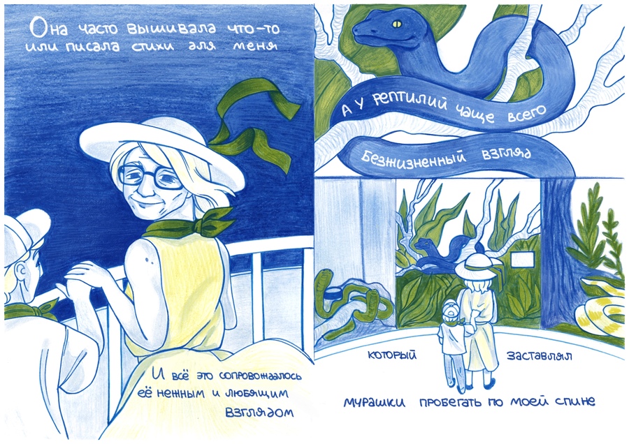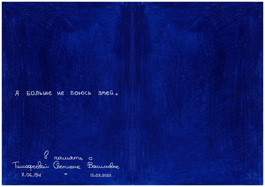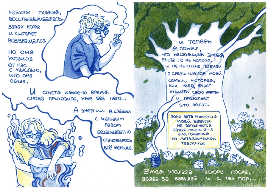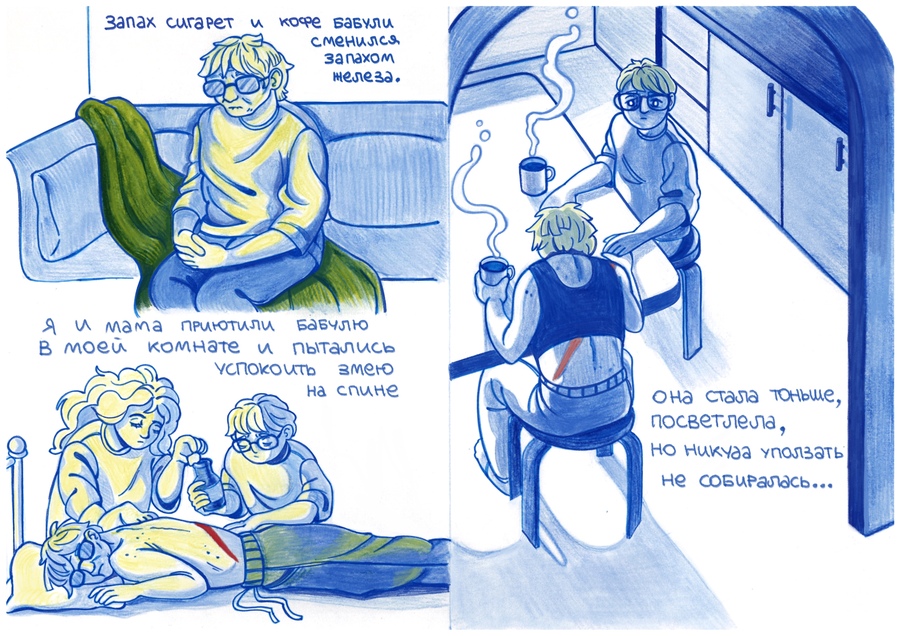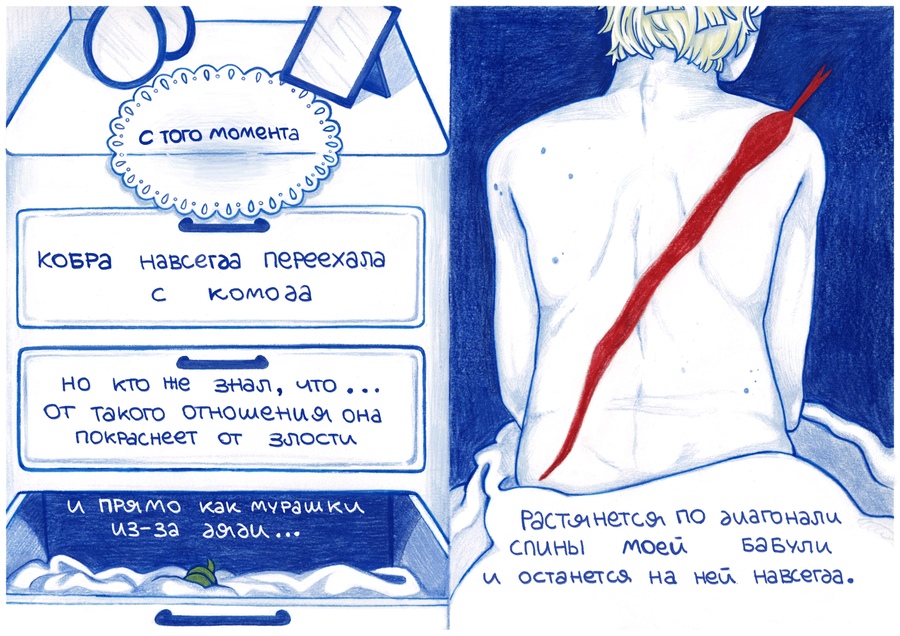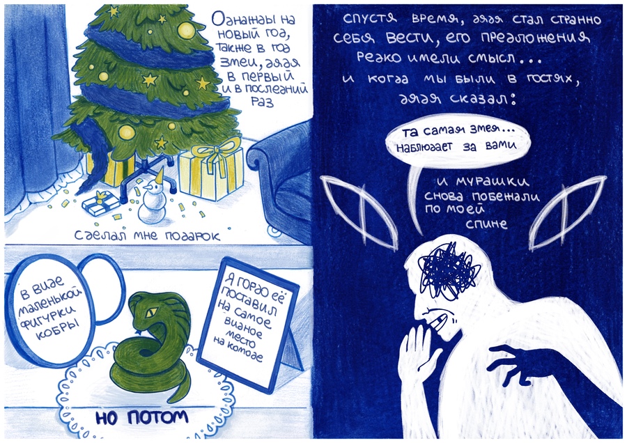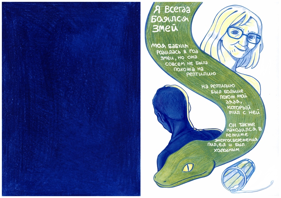 «Я боюсь змей» — это комикс о поиске причины моего детского страха змей, корни который, как оказалось, проходят гораздо глубже, чем просто боязнь самого животного. Моя дорогая бабушка родилась в год змеи, но она совсем не похожа на змею, в отличие от моего дяди больного шизофренией. Он, прямо как удав, держал в страхе и не отпускал свою жертву, в виде моей дорогой бабушки, до последнего.