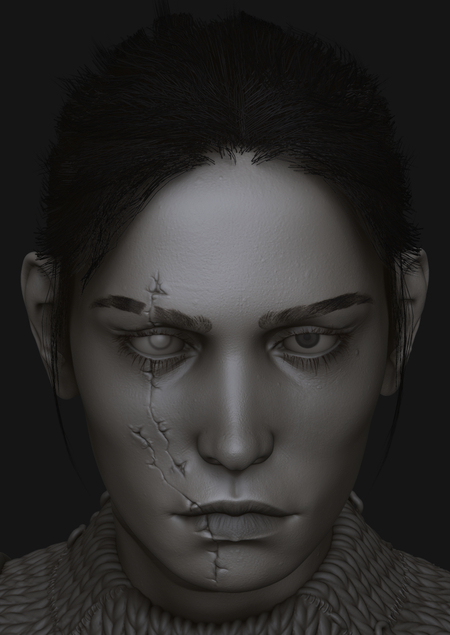 В процессе создании Зои произошли значительные изменения. Так как единственное, что могло отличить ее от сотни других военных моделей персонажей, было только лицо со шрамом. Я решила изменить шлем на удобную прическу, добавив очки с альтернативного концепта, где немного разбитые очки подчеркивали шрам Зои.