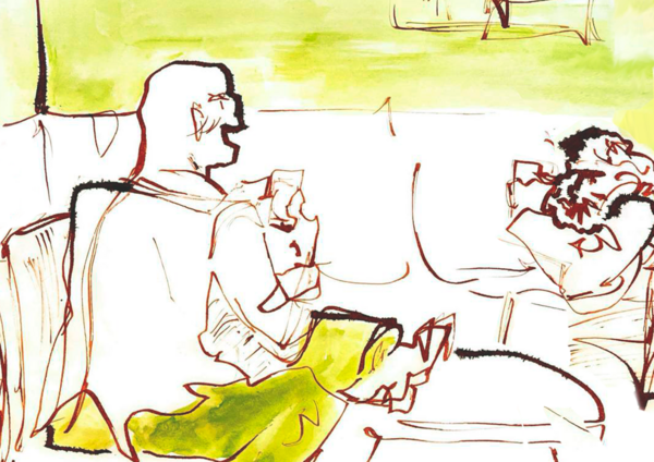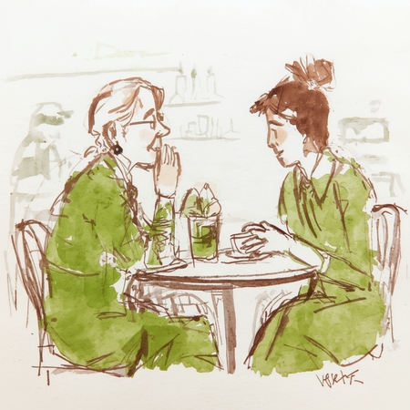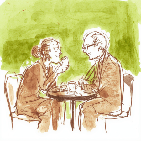 create a sketchy, simple, cartoony illustration with two people. this should be (two girls // an elderly couple (man and woman)) sitting opposite to each other in a cafe behind a small round table. the illustration is cropped so that only the table surface and upper half of man’s and woman’s bodies are visible. The first person is drinking coffee, while the second person is talking. both have happy expressions on their faces, look relaxed and enjoying their time. the technique shoud be chocolate brown ink and olive green watercolor, with a lively, a little messy touch and slight imperfections.
