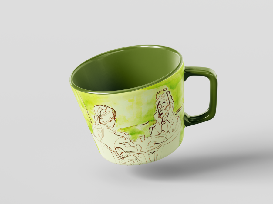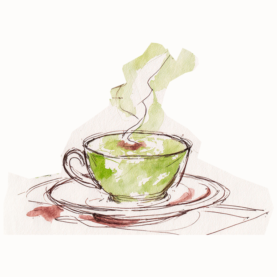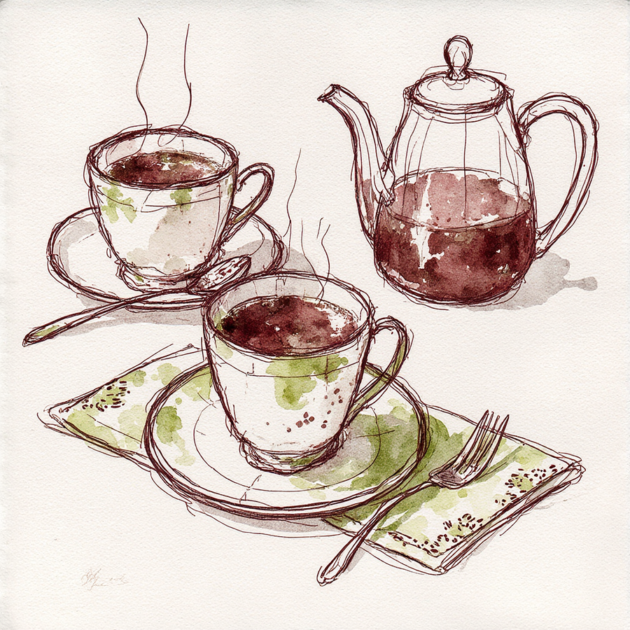 (прикрепляю свою графику, как референс) create minimalistic, sophisticated illustrations: coffee cup, coffee pot, teaspoon, lace napkin, in ink and watercolor technique, olive green and chocolate brown colors.
