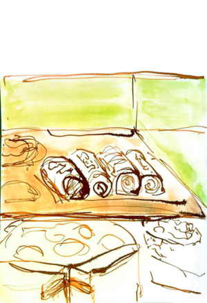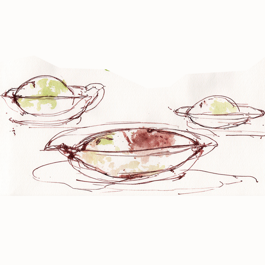 create minimalistic, sophisticated illustration of three plates, in ink and watercolor technique with sketchy, messy touch, olive green and chocolate brown colors.