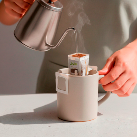 Create a close-up studio photo of a light-skinned person making a coffee in a mug with a drip bag from reference (прикрепляю референс одного дрип-пакетика, вырезанного прежде в photoshop с соседнего мокапа). The photo is cropped, so that only hands of a person and no face are visible.
