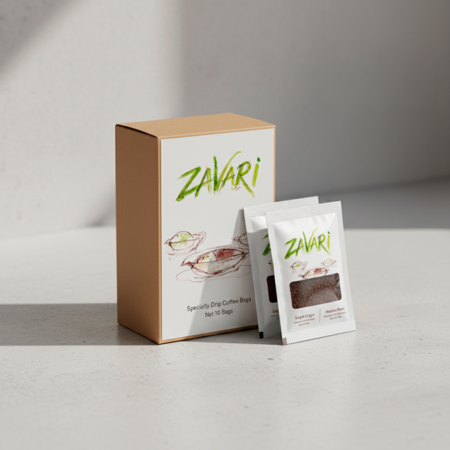 Create a studio photo mockup of drip coffee bags (a box for storage and separate bags) in minimalistic style, with logo from reference (прикрепляю референс-лого), placed on a neutral-colored surface. Вторым промптом (add graphics from reference to the mockup) добавляю графику