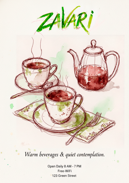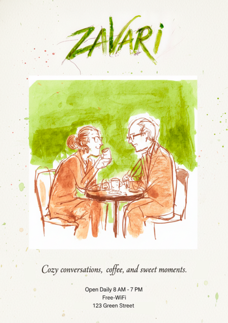 (прикрепляю референс своей графики) create a logo for a cafe named ZAVARI, an accent font similar to watercolor and ink technique, with a messy touch and slight imperfections, an olive green palette with touches of chocolate brown, a minimalist and sophisticated style.