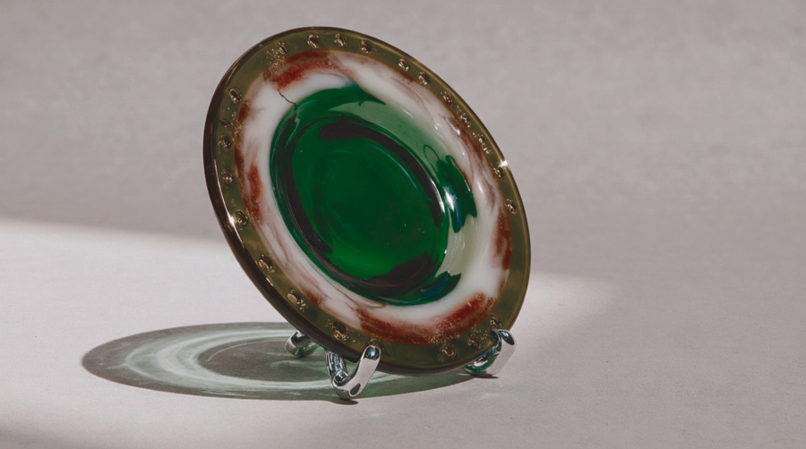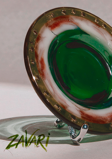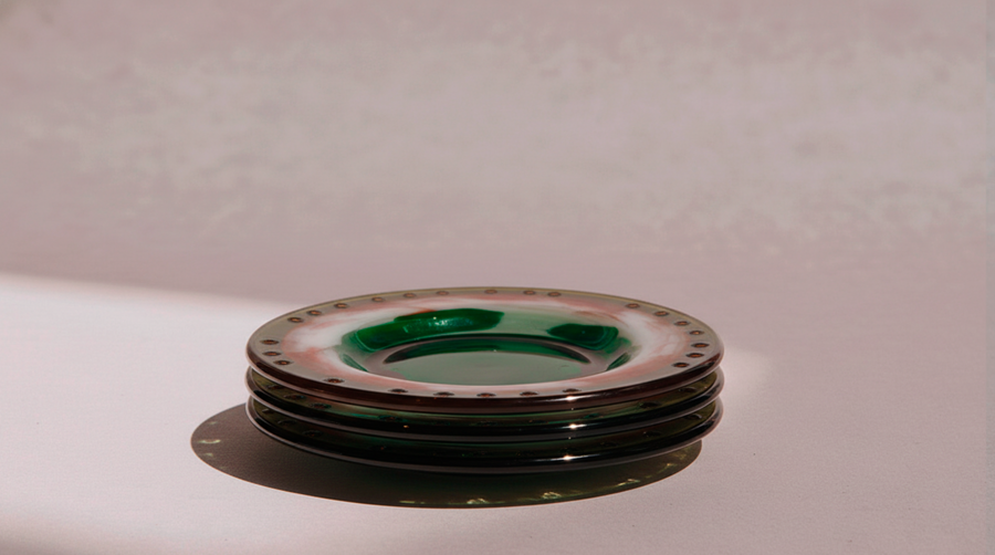 create a realistic studio photo of a round plate made of light olive green murano glass. the colors resemble a palette from reference (прикрепляю референс палитры) there are gradients and streaks which look like watercolor or marble. the plate is placed on a sophisticated metallic holder which shands on a neutral-colored surface.