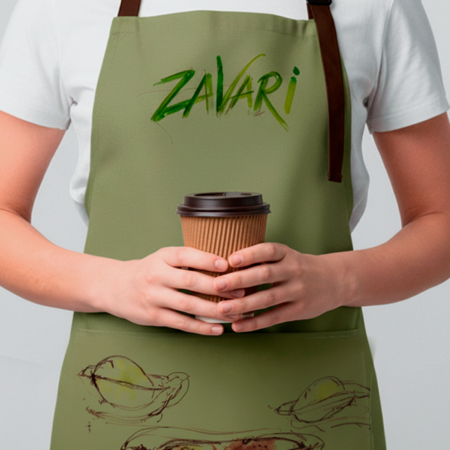Create a studio photo mockup of a person wearing an apron with logo and graphics from reference. the colors should be taken from palette at the reference. the photo is cropped so that the person’s face is not visible. make the person hold a craft coffee cup.