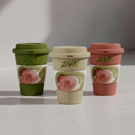 Create a studio photo mockup of three collapsible and reusable silicon coffee cups, using the logo and graphics from reference. the colors of cups should be different and taken from palette at the reference. the graphics should be bigger than logo and cropped, where necessary.